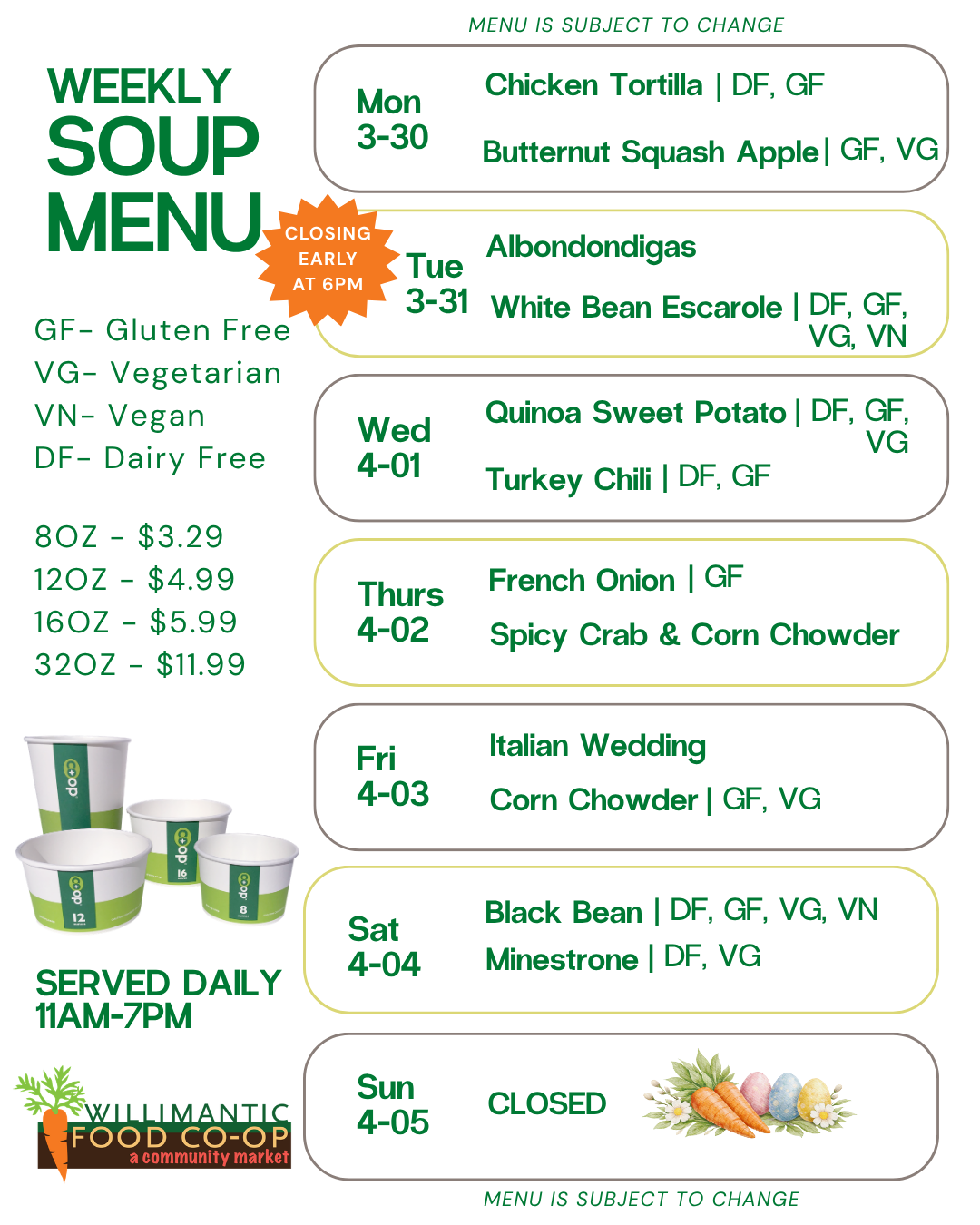 ** The Co-op will close at 6pm for Inventory on Tuesday March 31 **
