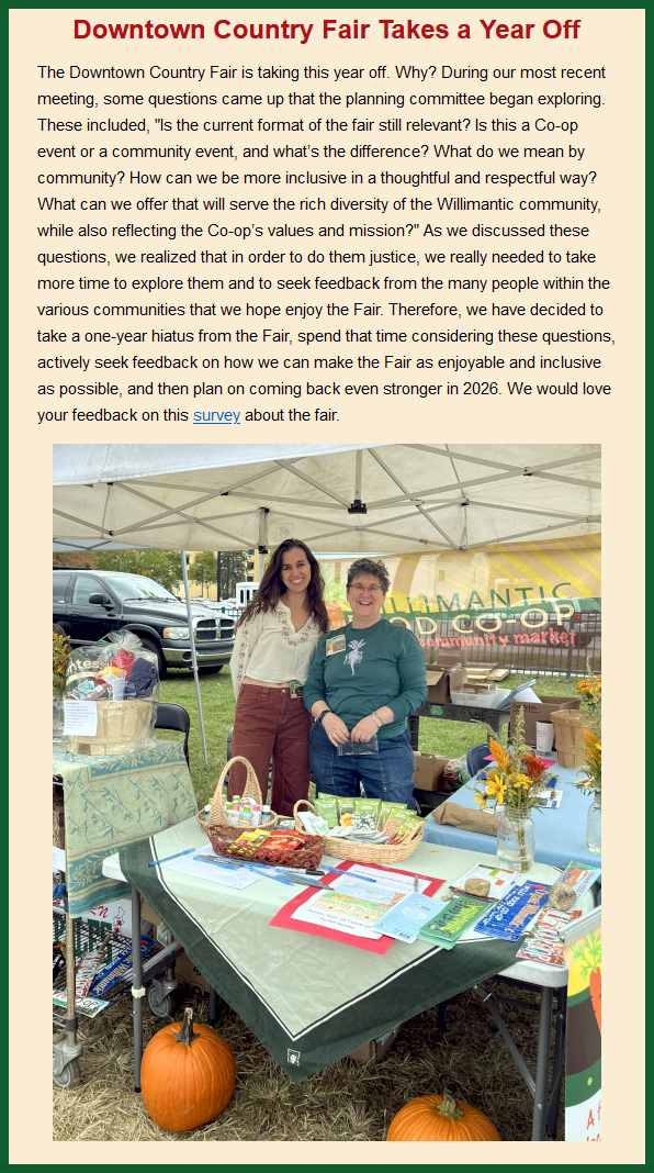 SATURDAY September 25th, 2021 11am-4pmWe missed you at the Fair last year! And we sure are happy to be getting ready for this year’s event! There will be music, food, and local craft vendors …all in the middle of our beautiful Town Green.